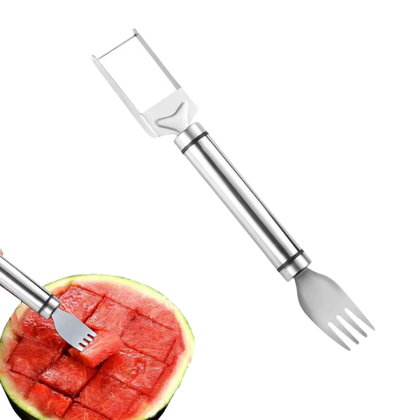 Facilite o preparo da sua melancia com este Cortador 2 em 1 em aço inoxidável. Ele corta em cubos perfeitos e já vem com garfo na ponta para servir, garantindo mais higiene, rapidez e praticidade. Ideal para churrascos, piqueniques ou para facilitar o dia a dia na cozinha.